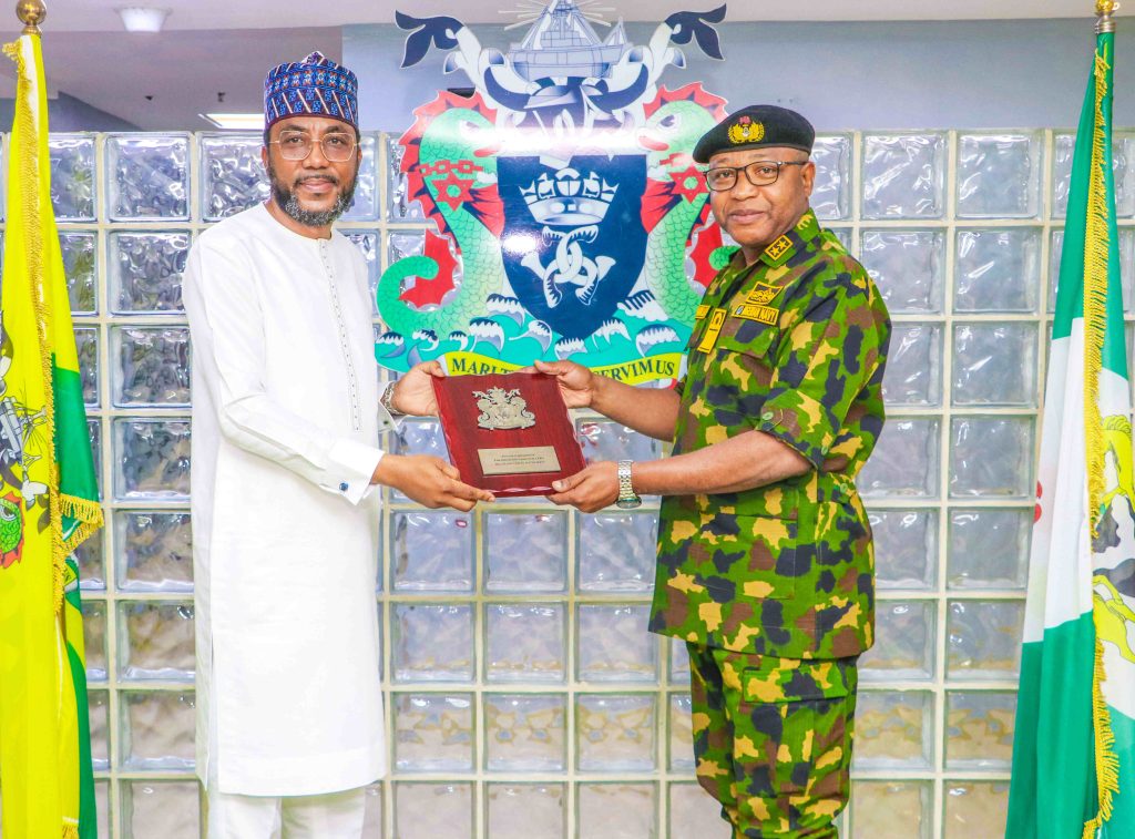 Managing Director, Nigerian Ports Authority, NPA, Mohammed Bello Koko, left, presents the Authority’s security’s plague to the Flag Officer Commanding Western Naval Command, Rear Admiral Mohammed MMiftah Abdullahi, during a working visit to the Management of NPA at the Marina,